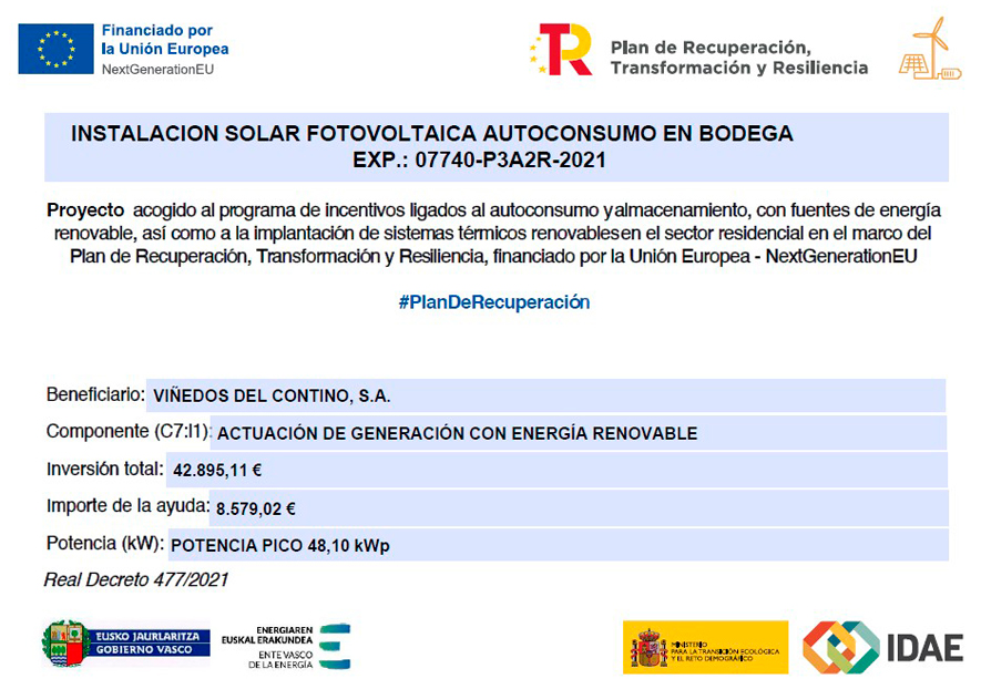 Viñedos del Contino ha incorporado placas solares en su bodega con el objetivo de reducir el consumo energético y las emisiones de CO2. Esta inversión refuerza el compromiso de la bodega con la sostenibilidad, contribuyendo a minimizar su huella de carbono y apostando por el uso de energías limpias en el corazón de Rioja Alavesa.