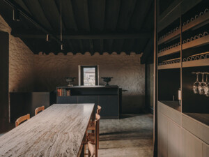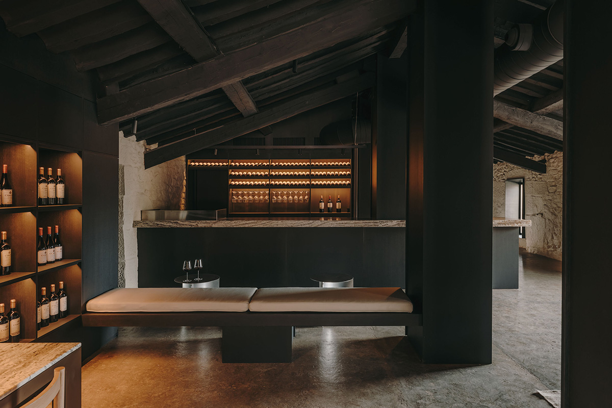 El estudio madrileño ha concebido una intervención que mantiene la estructura rústica original del edificio —pilares de ladrillo, muros de piedra— y la enriquece con materiales nobles como madera de roble tintada, mármol travertino y lino natural. El techo pintado de negro aporta amplitud, mientras que las nuevas aperturas regalan vistas privilegiadas sobre el viñedo y el río Ebro.